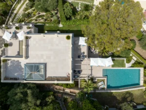 The villa provides 600m² of stylish living space across three levels, with guest and staff lifts ensuring easy access, including to a rooftop terrace with breathtaking Riviera and Mediterranean views. It features six luxurious bedrooms, with the master suite boasting a private lounge, home cinema, and terrace. The spacious 150m² main living area is complemented by a dining room, cinema space, and state-of-the-art home automation. Active guests can enjoy a fully-equipped gym.