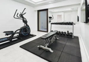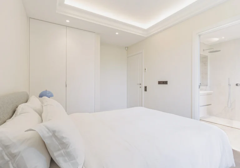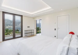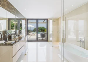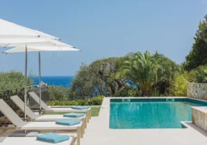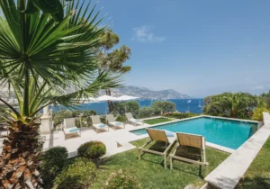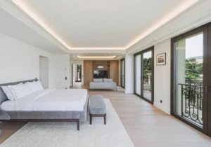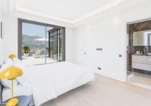 The home is set across three floors, connected by an elevator, and offers a grand entrance, expansive living areas, a dining area, and a fully equipped kitchen with a central island and a pantry, along with a total of six guest bedrooms. Each bedroom is furnished with luxurious bedding and en-suite bathrooms. The exceptional master suite features its own TV lounge, a lavish en-suite bathroom with a stand-alone bathtub, and a private terrace overlooking the Mediterranean. The villa also offers a home gym and an independent apartment, equipped to comfortably accommodate two staff members.