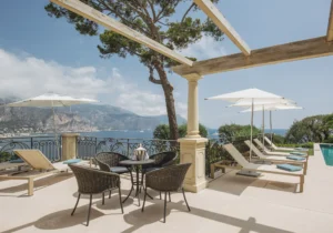 The exteriors feature meticulously landscaped gardens with a lush lawn and expansive terraces offering breathtaking views. Guests can also enjoy a heated pool surrounded by comfortable sunbeds, an al fresco dining area complete with a BBQ, spectacular views of the surrounding hills and Mediterranean Sea, and easy access to the nearby beaches and the town center of Saint-Jean-Cap-Ferrat, making this home an ideal getaway on the French Riviera.