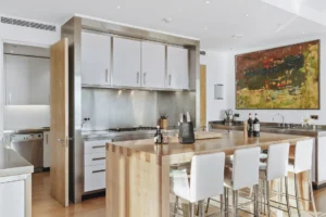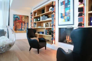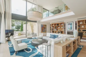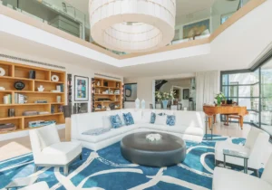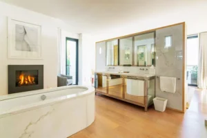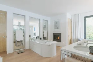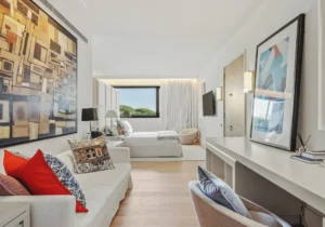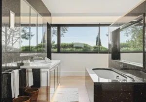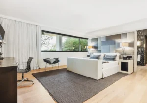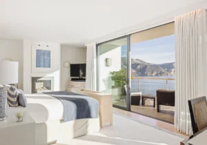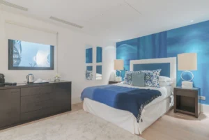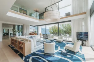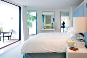 The interior spaces are bright with natural light, spacious and decorated to the highest possible standard. The cool white walls, modern sofas, stunning reception, beds, and dining room are nothing short of impressive. In addition, the glass elevator is a showstopper in itself and offers guests a way to enjoy the view as they travel from one floor to the next.