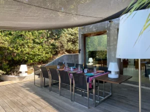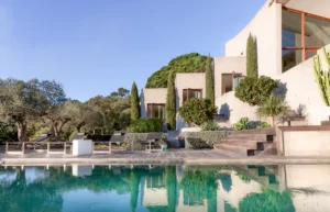 At High Ticket Brokers, we present Villa In the heights of the Croix-Valmer hills, surrounded by huge cacti, the silhouette of this villa pulls inspiration from Mexican architecture. The swimming pool blends into the infinite landscape of pine trees and sea.