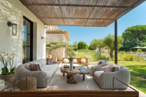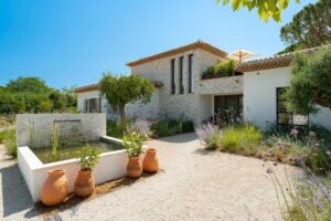 Perched on the heights of Ramatuelle, Villa des moulins opens up to a spectacular view where nature seems to stretch endlessly. Just a short distance away, Pampelonne and its lively spots offer a dynamic escape.