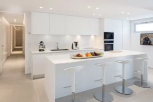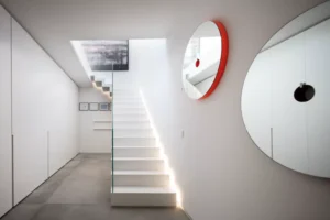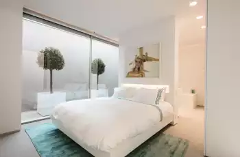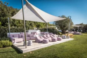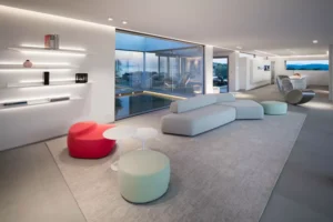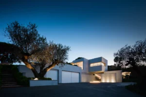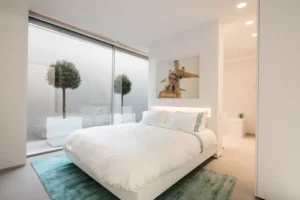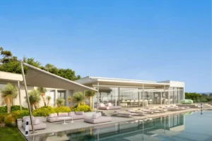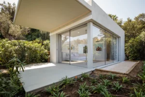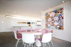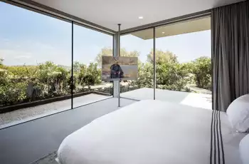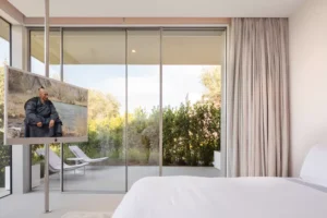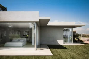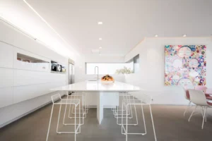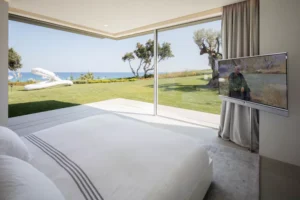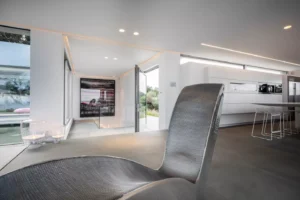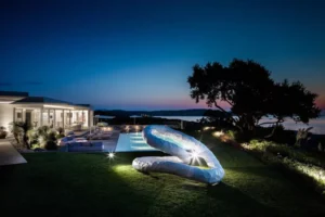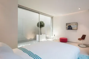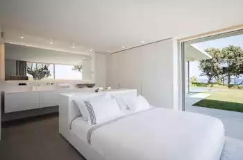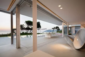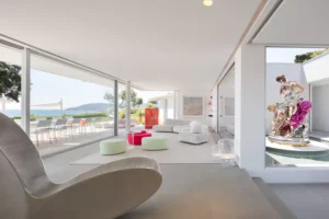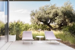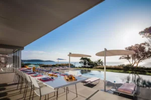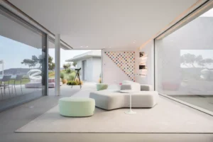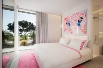 Sculpted from concrete and glass, this villa stands at the centre of a huge expanse of manicured lawn. On the terrace overlooking the sea, striking parasols and baby pink deckchairs lend the pool a certain ‘Ocean Drive’ chic. Inside the house, floor-to-ceiling windows and cool white walls ensure that the elegant contemporary design scheme takes centre stage. Designer furniture, poppy colours and neon lighting bring an added, trendy twist. In the lounge-dining room, the vibrant pink table and colourful contemporary artwork on the walls provide a punchy counterpoint to the minimalist refinement of the kitchen. Turquoise, fuchsia and lime green rugs liven up the pearl grey floors of the bedrooms.