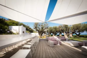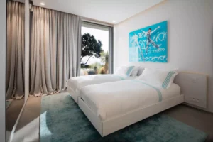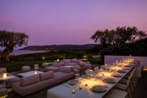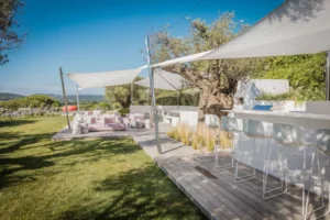 The villa is just a short stroll from the exclusive Nikki Beach Club, accessible via its own private road. You can also head up to Tahiti Beach for a mojito on the sand, looking out to sea from the colourful terrace of Moorea. As the sun begins to set, head back up to the villa and enjoy the superb view of the Mediterranean from the private swimming pool, as the kids play hide-and-seek in the olive groves.