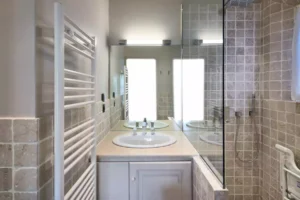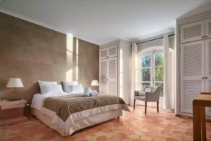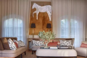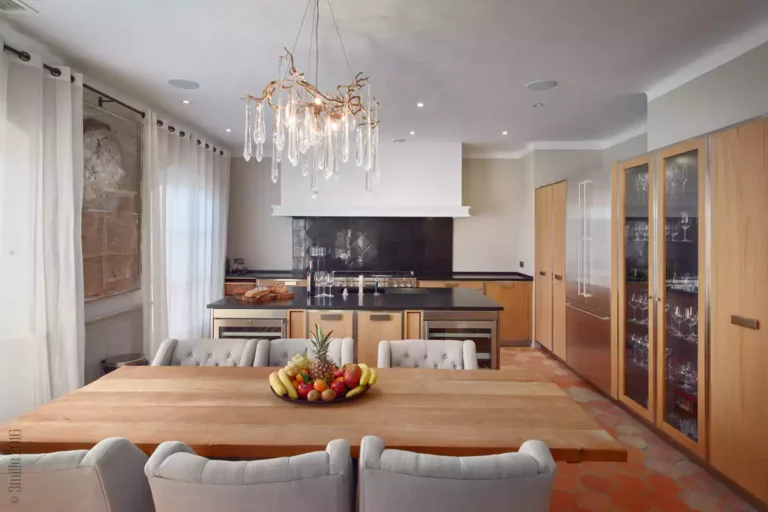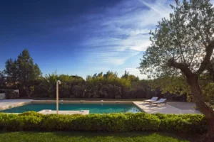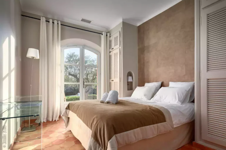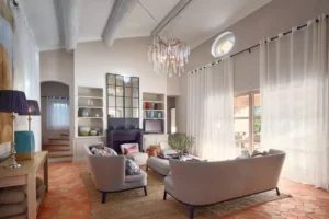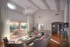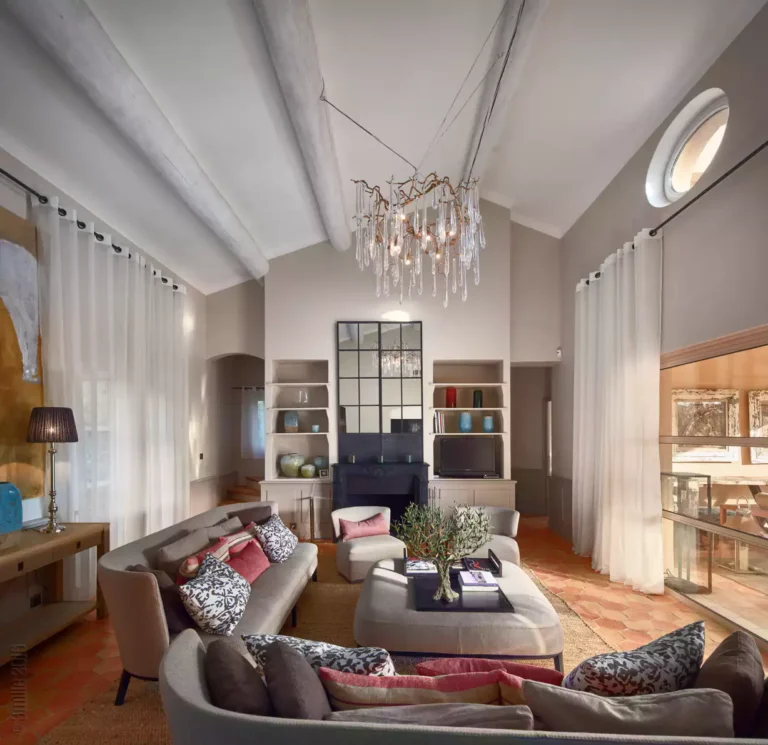 At High Ticket Brokers, we present Villa la Santolina , Sand-coloured façade, huge white windows, tiled patio : this villa is a proudly Provençal affair. Inside, traditional design features – tiled floors and wooden beams – are updated with a dose of contemporary chic. In the immense, sun-drenched lounge, cream sofas are arranged around a coffee table bearing its very own olive tree, beneath a magnificent crystal chandelier. The bedrooms are colourful and spacious, with massive white wardrobes bringing back memories of childhood summers in the south.