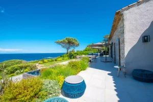 Minimalist yet playful, this stone-covered villa enchants us with its garden and its view of the endless blue sea.