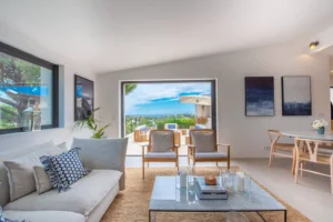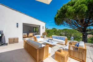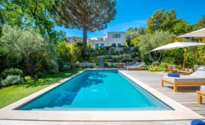Villa Pace, perched in Sainte-Maxime, opens up to the Gulf of Saint-Tropez, where sky meets sea. Its modern architecture blends seamlessly with the surrounding nature, merging sleek lines with Mediterranean softness.